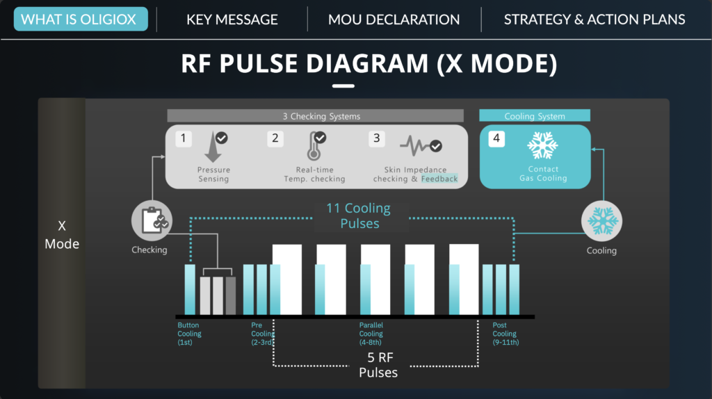 โปรแกรม OligioX คือเทคโนโลยียกกระชับผิว ที่ออกแบบมาเพื่อแก้ไขปัญหาผิวหย่อนคล้อยและริ้วรอยแห่งวัยอย่างมีประสิทธิภาพ โดยใช้พลังงานคลื่นวิทยุ Monopolar Radiofrequency (RF) ส่งพลังงานเข้าไปสู่ชั้นหนังแท้ (Dermis) และเนื้อเยื่อคอลลาเจนที่แทรกตัวตามไขมันหรือ Retinacula cutis เพื่อกระตุ้นการหดรัดตัวของคอลลาเจนในหนังแท้ และคอลลาเจนรอบไขมัน ทำให้ทั้งผิวหนังและไขมันกระชับขึ้น พร้อมทั้งกระตุ้นการสร้างคอลลาเจนใหม่ทำให้ได้ผลที่ดีขึ้นในระยะยาว ด้วยคุณสมบัติที่ช่วยฟื้นฟูโครงสร้างผิวจากภายใน